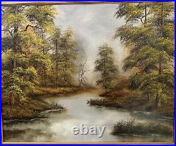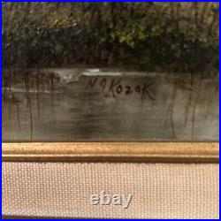 QThis is an original oil painting on canvas by artist N G Kozak. The painting depicts a landscape with woods and a stream, done in a realist style. It is medium-sized, measuring 16 inches in height and 20 inches in width. The painting is signed by the artist and framed in gilt. This handmade piece showcases nature in a multi-color palette, perfect for art collectors or enthusiasts.