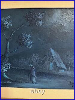This vintage mid-century Oscar Parra signed oil painting is a stunning piece of art that captures the essence of a peaceful landscape. Produced in 1966, this original piece features beautiful shades of blue that depict a serene afternoon. The canvas is medium in size and has been framed to enhance the painting's beauty.