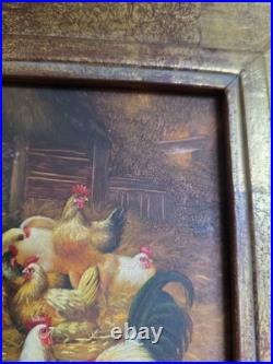 This is an ornate oil painting in a wood gold-toned frame, signed by P. Clark on the front, and with Robert Grace's sticker on the back of the artwork. It features a barnyard scene of roosters and chickens. The frame is 14"x16". It is a deep frame at 2 1/2.