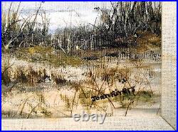 Size: Painting: 8 in x 16 in - Framed: 16.5 in x 24.5 in. An Ocean view between the Reeds, on a Drab Overcast Day on a Florida Beach Coastline. Artist Signed: Joan Rivers, of Cocoa Beach Florida, a well-known painter of Central Florida Coastal areas.